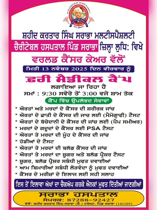 Shaheed Kartar Singh Sarabha Charitable Hospital at village Sarabha is a multi Specialty Charitable Hospital situated in the heart of vast rural belt.